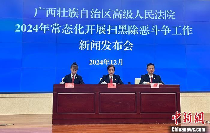 当天,广西壮族自治区高级人民法院举行新闻发布会,介绍2024年全区法院常态化开展扫黑除恶斗争的工作情况,同时公布四起重大黑恶势力犯罪案件处理结果。